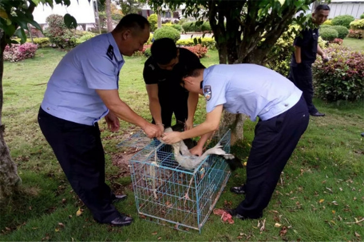 5月31日9时30分,勐醒村委会景岗村村民到山上收胶水,经过勐醒村委会景岗村水坝公路时,发现一只大鸟在路边,发现来人,大鸟展翅想飞起离开,但飞不起来,肯定受伤了。村民想到公安机关平时对保护动物的宣传,就打了电话向勐仑派出所勐醒警务室报警,希望帮助下这个小动物。接到报警民警就及时赶到现场,民警小心的将大鸟抓住,带回警务室,经与勐仑保护所联系,确认属于二级保护动物钳嘴鹤,世界濒危动物。钳嘴鹤已由保护所送到小勐养景洪市野生动物救助中心治疗。