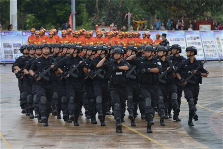 “现在向我们走来的是勐腊县公安局男子防爆枪方队,他们日夜守护在边境一线,用青春、热血、纲纪筑成一座座丰碑,用忠诚、信念、决心谱一曲曲感人篇章,用智慧、果敢、力量践行着人民卫士的庄严承诺。”11月26日,云南省西双版纳州公安机关在勐腊县举行2016反恐演练暨第十一届“前卫杯”运动会开幕式,参加检阅的公安民警和武警、边防、消防官兵步履整齐的分列队式和精湛娴熟的警务技战术表演,让前来观看的市民赞叹不已。