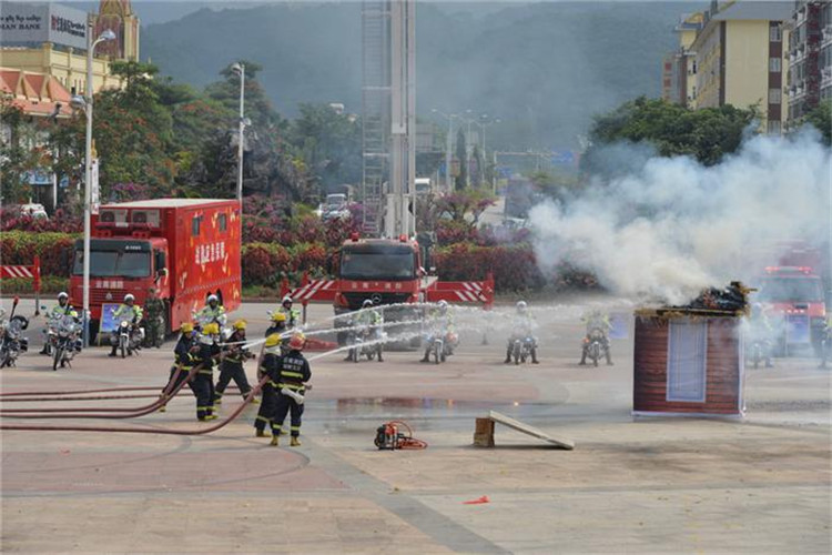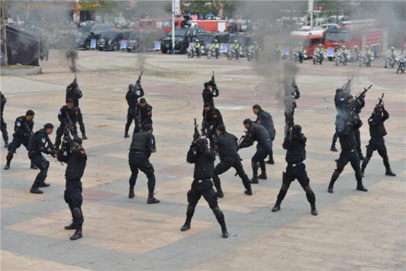 当天,来自州公安局、景洪市公安局、勐海县公安局、勐腊县公安局、森林公安局、水上支队、边防支队、消防支队、武警支队、交警支队共13个方块队共计777人参加反恐演练,现场展示了警用摩托车、警用越野车、特别警务装甲车、特警巡逻车、消防防灭火车、消防后勤保障车等警用装备。