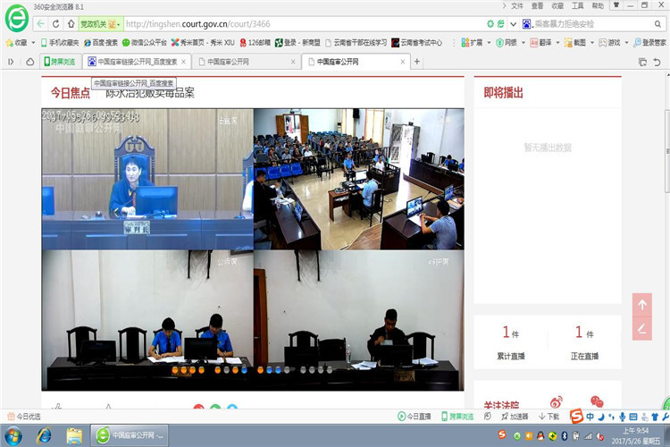 2017年5月26日上午9时,勐腊县法院首次通过中国庭审公开网、新浪微博、微信公众号公开审理被告人陈某贩卖毒品实况,本次庭审过程持续1小时,整个庭审过程信号良好,画面清晰,声音明亮,667人次通过网络直播系统观看了庭审实况。