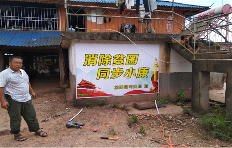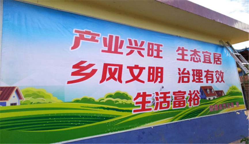 在帮扶过程中,司法局在人口来往密集的公房侧面和周边喷绘了“产业兴旺、生态宜居、乡风文明、治理有效、生活富裕”和“消除贫困、同步小康”的扶贫标语。标语制作采用了制作工艺简单,材料实用、耐用的用材。